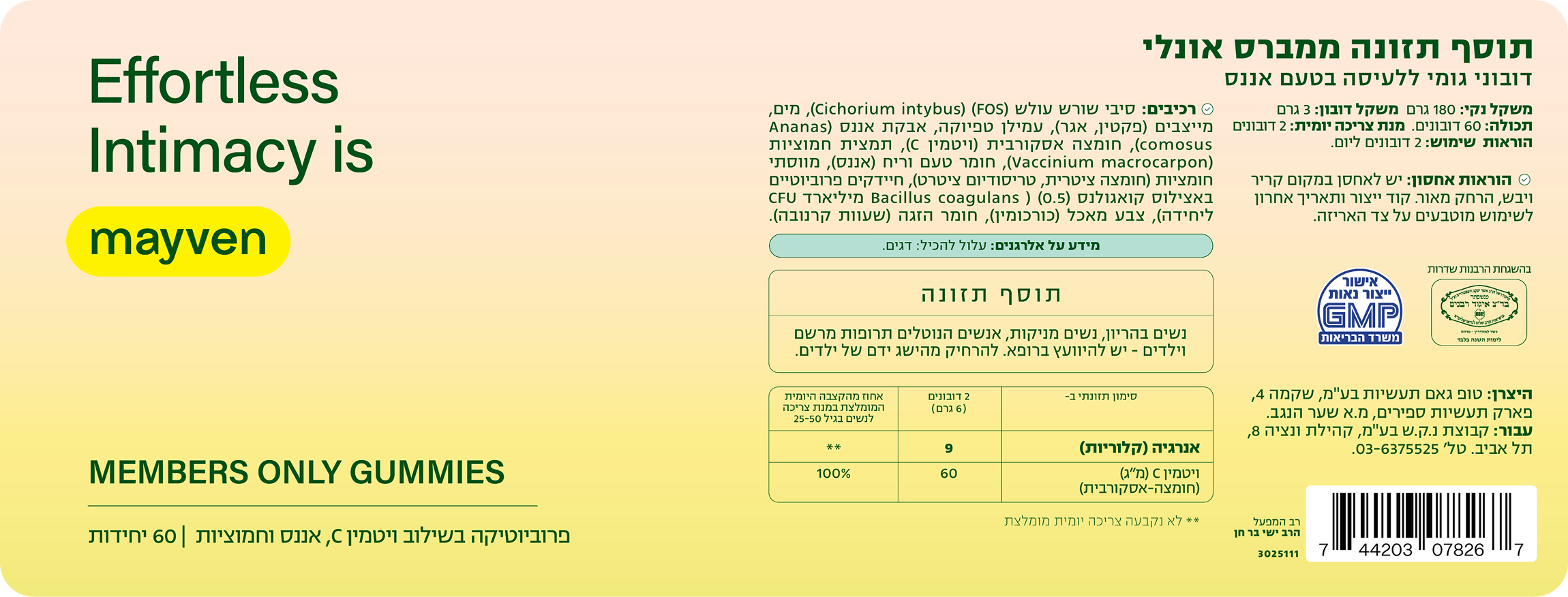 פרוביוטיקה לאיזור האינטימי בדובוני אננס עם חמוציות וויטמין סי שנבחרו בקפידה לאזן את רמות הPH שם למטה ולהרים לך את הבטחון והרעננות מבפנים